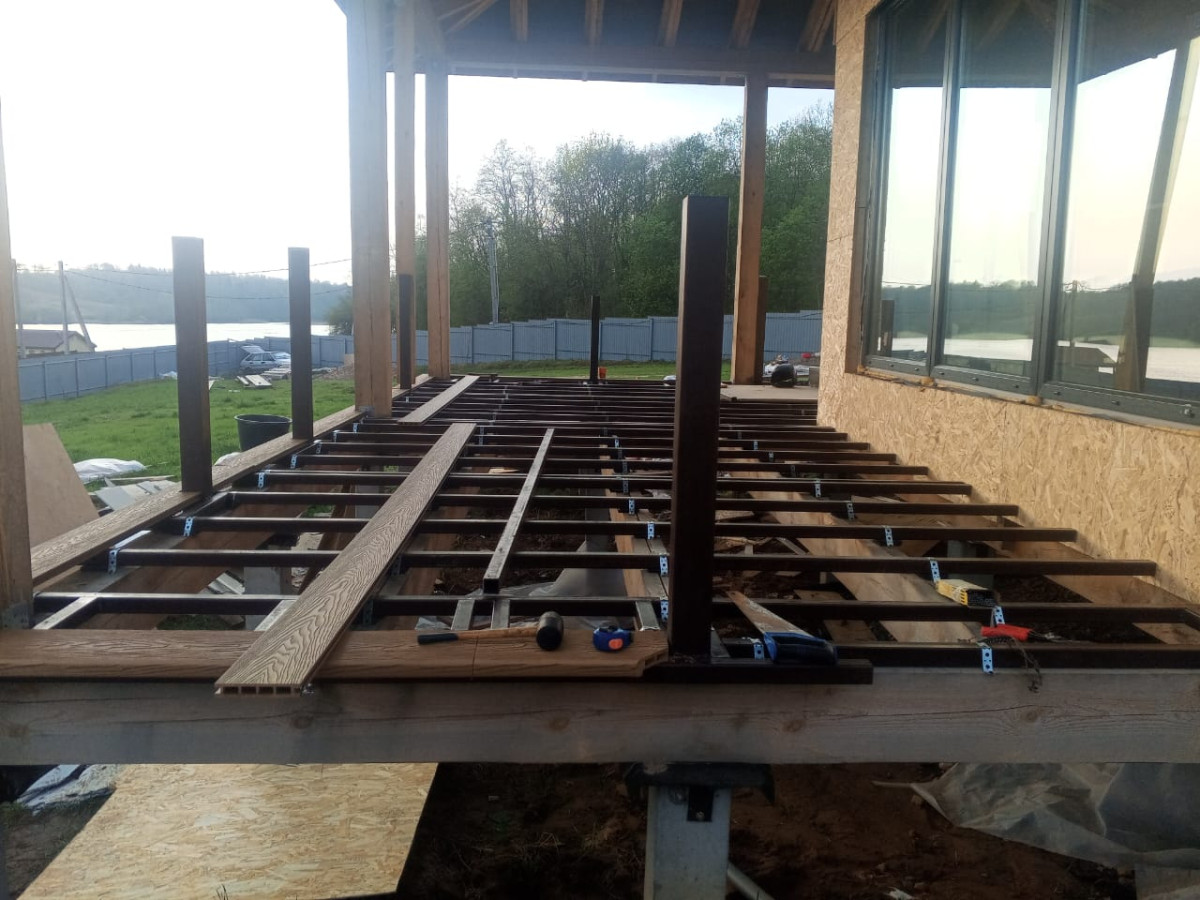 На каркас из бруса установлен металлопрофиль и смонтирована доска. По периметру отделка ступенью шириной 165 мм. Сделаны ступени и ограждение.